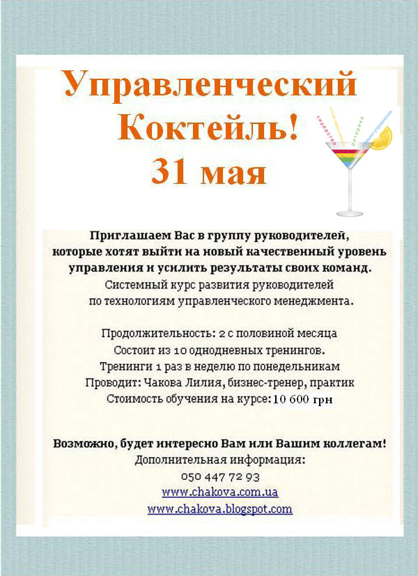 Стоимость курса «Управленческий Коктейль» - 10 600 грн (за 10 тренингов)